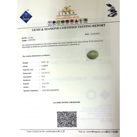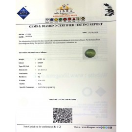 REPORT.NO.-LC 495CLARITY.-N/ACOLOUR.-L . GREENSHAPE/CUT.-OVALWT.-15.02 CTSDIMENSION.-6-4.2-4.10-6.R.INDEX.-1.54-1.55HARDNESS.-7.5COMMENT.-CATS EYE { S . QUARTZ }..