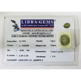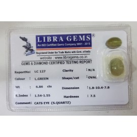 REPORT NO . LC 127CLARITY . N/ACOLOUR . L . GREENSHAPE / CUT . OVALWT . 6.86 CTSDIMENSION . 1-8.10-4.7-8.R . INDEX . 1.54-1.55HARDNESS . 7.5COMMENT . CATS EYE { S . QUARTZ }..