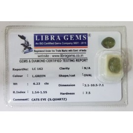 REPORT NO . LC 162CLARITY . N/ACOLOUR . L . GREENSHAPE / CUT . OVALWT . 6.23 CTSDIMENSION . 2-1.10-5.7-1.R . INDEX . 1.54-1.55HARDNESS . 7.5COMMENT . CATS EYE { S . QUARTZ }..