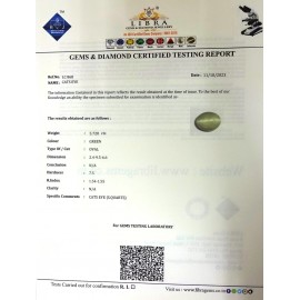 REPORT.NO.-LC 680CLARITY.-N/ACOLOUR.-GREENSHAPE/CUT.-OVALWT.-4.94 CTSDIMENSION.-1-1.9-2.6-9.R.INDEX.-1.54-1.55HARDNESS.-7.5COMMENT.-CATS EYE { S. QUARTZ }..