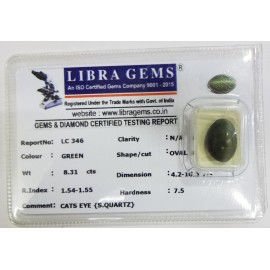 REPORT.NO.-LC 346CLARITY.-N/ACOLOUR.-GREENSHAPE/CUT.-OVALWT.-8.31 CTSDIMENSION.-4-2.10-3.7-9.R.INDEX.-1.54-1.55HARDNESS.-7.5COMMENT.-CATS EYE { S . QUARTZ }..