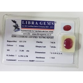 REPORT NO . LR 174CLARITY . N/ACOLOUR . PINKSHAPE / CUT . OVALWT . 7.30 CTSDIMENSION . 2-3.9-9.5-4.R . INDEX . 1.76-1.78HARDNESS . 9.0COMMENT . RUBY..