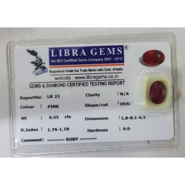 REPORT NO . LR 23CLARITY . N/ACOLOUR . PINKSHAPE / CUT . OVALWT . 6.55 CTSDIMENSION . 1-8.8-1.6-5.R . INDEX . 1.76-1.78HARDNESS . 9.0COMMENT . RUBY..
