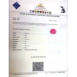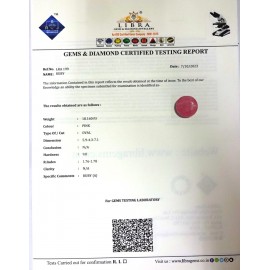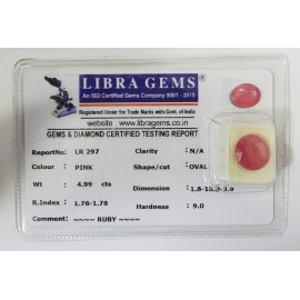 REPORT.NO.-LR 297CLARITY.-N/ACOLOUR.-PINKSHAPE/CUT.-OVALWT.-4.99 CTSDIMENSION.-1.8-10.8-3.9R.INDEX.-1.76-1.78HARDNESS.-9.0COMMENT.-RUBY..