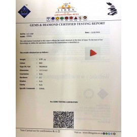 REPORT.NO.LCI 433CLARITY.N/ACOLOUR.REDSHAPE/CUT.TRIANGLEWT.3.20 CTSDIMENSION.10.4-10.1-5.2R.INDEX.N/AHARDNESS.3.5COMMENT.CORAL..