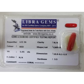REPORT NO. LCI 36CLARITY. N/ACOLOUR. REDSHAPE/CUT. CAPSULEWT. 5.95 CTSDIMENSION. 10.9-6.1-5.4R. INDEX. N/AHARDNESS. 3.5COMMENT. CORAL..