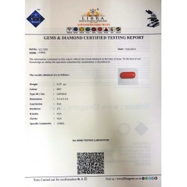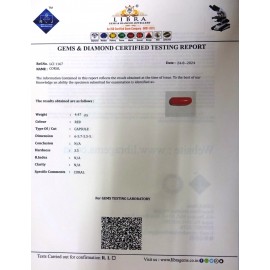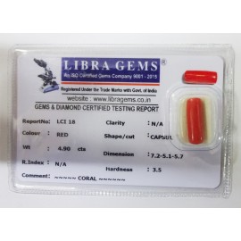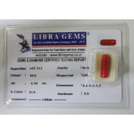 REPORT NO . LCI 312CLARITY . N/ACOLOUR . REDSHAPE / CUT . CAPSULEWT . 4.30 CTSDIMENSION . 5-1.5-4.5-5.R . INDEX . N/AHARDNESS . 3.5COMMENT . CORAL..