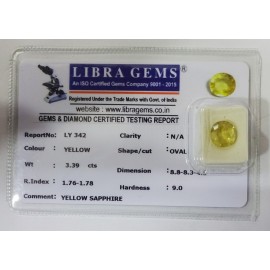REPORT NO . LY 342CLARITY . N/ACOLOUR . YELLOWSHAPE / CUT . ROUNDWT . 3.39 CTSDIMENSION . 8-8.8-3.4-5.R . INDEX . 1.76-1.78HARDNESS . 9.0COMMENT . YELLOW SAPPHIRE..