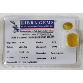 REPORT NO . LY 44CLARITY . N/ACOLOUR . YELLOWSHAPE / CUT . OVALWT . 9.64 CTSDIMENSION . 4-7.2-6.5-2.R . INDEX . 1.76-1.78HARDNESS . 9.0COMMENT . YELLOW SAPPHIRE..