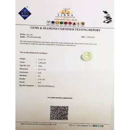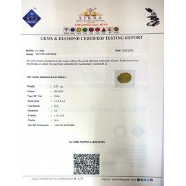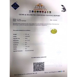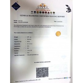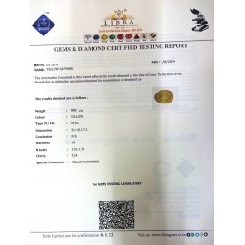 REPORT NO . LY 103CLARITY . N/ACOLOUR . YELLOWSHAPE / CUT . OVALWT . 6.35 CTSDIMENSION . 2-2.10-4.4-6.R . INDEX . 1.76-1.78HARDNESS . 9.0COMMENT . YELLOW SAPPHIRE..