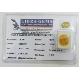 REPORT.NO.LY 587CLARITY.N/ACOLOUR.YELLOWSHAPE/CUT.OVAL WT.8.07 CTSDIMENSION.2.3-10.2-5.6R.INDEX.1.76-1.7.8HARDNESS.9.0COMMENT.YELLOW SAPPHIRE..