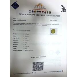 REPORT NO . LY 144CLARITY . N/ACOLOUR . YELLOWSHAPE / CUT . OVALWT . 4.18 CTSDIMENSION . 8-9.8-1.5-6.R . INDEX . 1.76-1.78HARDNESS . 9.0COMMENT . YELLOW SAPPHIRE..