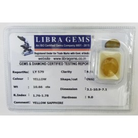 REPORT.NO.LY 579CLARITY.N/ACOLOUR.YELLOWSHAPE/CUT.OVAL WT.10.66 CTSDIMENSION.3.1-10.2-7.1R.INDEX.1.76-1.7.8HARDNESS.9.0COMMENT.YELLOW SAPPHIRE..