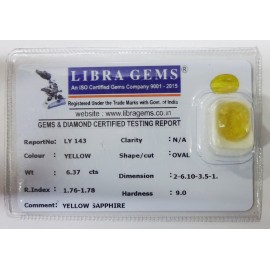REPORT NO . LY 143CLARITY . N/ACOLOUR . YELLOWSHAPE / CUT . OVALWT . 6.37 CTSDIMENSION . 2-6.10-3.5-1.R . INDEX . 1.76-1.78HARDNESS . 9.0COMMENT . YELLOW SAPPHIRE..