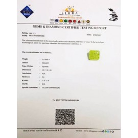 DATE:4-8-2023REF.NO:LYA 325NAME:YELLOW SAPPHIREWEIGHT:11.06 CTSCOLOUR:YELLOWTYPE OF/CUT:SQUAREDIMENSION:10.7-10.3-8.2CONCLUSION:N/AHARDNESS:9.0R.INDEX:1.76-1.78CLARITY:N/ASPECIFIC COMMENTS:Y..