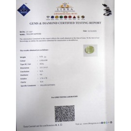 REPORT.NO.-LY 433CLARITY.-N/ACOLOUR.-YELLOWSHAPE/CUT.-OVALWT.-3.78 CTSDIMENSION.-10-2.8-8.4-2.R.INDEX.-1.76-1.78HARDNESS.-9.0COMMENT.-YELLOW SAPPHIRE..