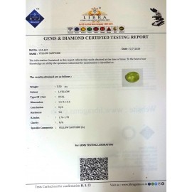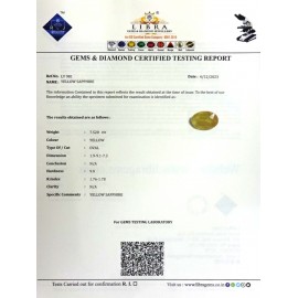 REPORT NO . LY 247CLARITY . N/ACOLOUR . YELLOWSHAPE / CUT . OVALWT . 5.37 CTSDIMENSION . 10-1.9-3.5-8.R . INDEX . 1.76-1.78HARDNESS . 9.0COMMENT . YELLOW SAPPHIRE..