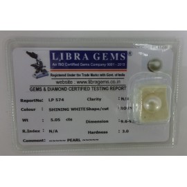 REPORT NO . LP 574CLARITY . N/ACOLOUR . SHINING WHITESHAPE / CUT . ROUNDWT . 5.05 CTSDIMENSION . 9-6.9-6.6-6.R . INDEX . N/AHARDNESS . 3.0COMMENT . PEARL..