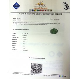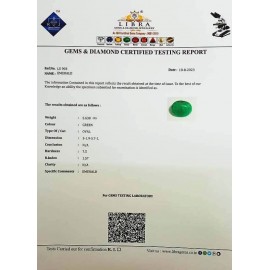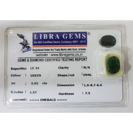 REPORT NO . LE 34CLARITY . N/ACOLOUR . GREENSHAPE / CUT . OVALWT . 5.02 CTSDIMENSION . 1-9.8-7.6-6.R . INDEX . 1.57HARDNESS . 7.5COMMENT . EMERALD..