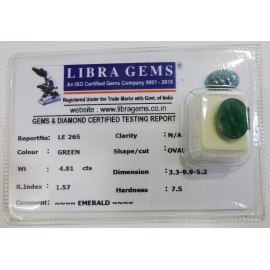 REPORT.NO.- LE 265CLARITY.-N/ACOLOUR.-GREENSHAPE/CUT.-OVALWT.-4.81 CTSDIMENSION.-3-3.9-9.5-2.R.INDEX.-1.57HARDNESS.-7.5COMMENT.-EMERALD..