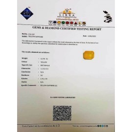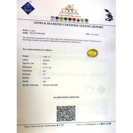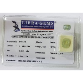 REPORT NO . LYS 38CLARITY . N/ACOLOUR . L . YELLOWSHAPE / CUT . OVALWT . 5.12 CTSDIMENSION . 10-6.8-3.5-6.R . INDEX . 1.76-1.78HARDNESS . 9.0COMMENT . YELLOW SAPPHIRE { S }..