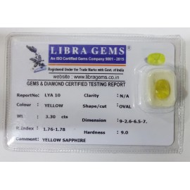 REPORT NO . LYA 10CLARITY . N/ACOLOUR . YELLOWSHAPE / CUT . OVALWT . 3.30 CTSDIMENSION . 9-2.6-6.5-7.R . INDEX . 1.76-1.78HARDNESS . 9.0COMMENT . YELLOW SAPPHIRE..