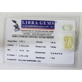 REPORT NO . LYS 1CLARITY . N/ACOLOUR . L . YELLOWSHAPE / CUT . OVALWT . 6.74 CTSDIMENSION . 2-6.8-4.5-8.R . INDEX . 1.76-1.78HARDNESS . 9.0COMMENT . YELLOW SAPPHIRE { S }..