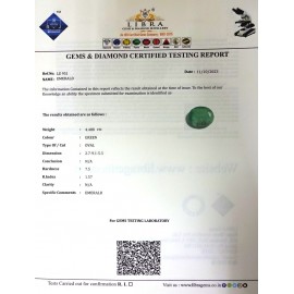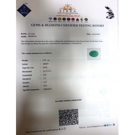 REPORT.NO.-LEC 15CLARITY.-N/ACOLOUR.-GREENSHAPE/CUT.-OVALWT.-3.43 CTSDIMENSION.-1-2.9-2.6-6.R.INDEX.-1.57HARDNESS.-7.5COMMENT.-EMERALD { C }..