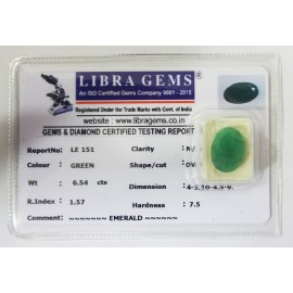 REPORT NO . LE 151CLARITY . N/ACOLOUR . GREENSHAPE / CUT . OVALWT . 6.54 CTSDIMENSION . 4-3.10-4.5-9.R . INDEX . 1.57HARDNESS . 7.5COMMENT . EMERALD..