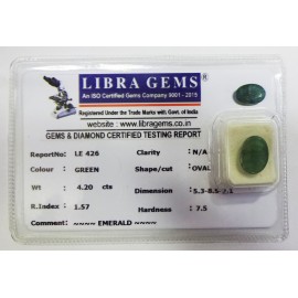 REPORT.NO.LE 426CLARITY.N/ACOLOUR.GREENSHAPE/CUT.OVALWT.4.20 CTSDIMENSION. 5-3.8-5.2-1.R.INDEX.1.57HARDNESS.7.5COMMENT.EMERALD..