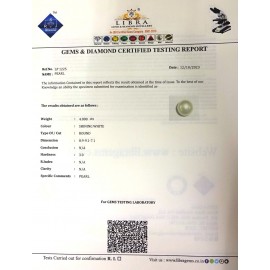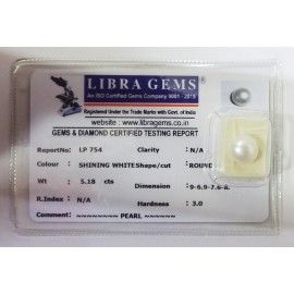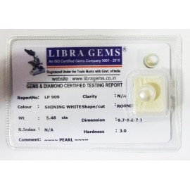 REPORT NO. LP 909CLARITY. N/ACOLOUR . SHINING WHITESHAPE/CUT. ROUNDWT. 5.48 CTSDIMENSION. 9.7-9.8-7.1HARDNESS. 3.0R.INDEX. N/ACOMMENT. PEARL..