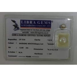 REPORT NO . LP 516CLARITY . N/ACOLOUR . SHINING WHITESHAPE / CUT . ROUNDWT . 5.00 CTSDIMENSION . 9-2.9-2.6-9.R . INDEX . N/AHARDNESS . 3.0COMMENT . PEARL..