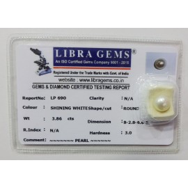 REPORT NO . LP 690CLARITY . N/ACOLOUR . SHINING WHITESHAPE / CUT . ROUNDWT . 3.86 CTSDIMENSION . 8-2.8-6.6-8.R . INDEX . N/AHARDNESS . 3.0COMMENT . PEARL..