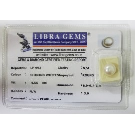 REPORT.NO-LP 992CLARITY-N/ACOLOUR-SHINING WHITESHAPE/CUT-ROUNDWT-4.55 CTSDIMENSION-8.9-9.1-6.9R.INDEX-N/AHARDNESS-3.0COMMENT-PEARL..