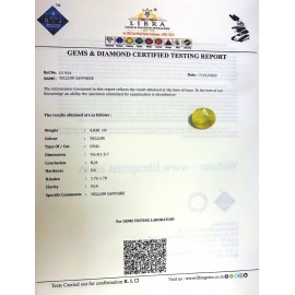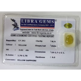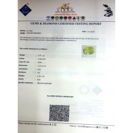 REPORT NO . LY 49CLARITY . N/ACOLOUR . YELLOWSHAPE / CUT . OVALWT . 3.56 CTSDIMENSION . 1-1.7-3.4-2.R . INDEX . 1.76-1.78HARDNESS . 9.0COMMENT . YELLOW SAPPHIRE..