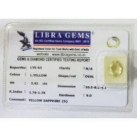 REPORT.NO.-LYS 63CLARITY.-N/ACOLOUR.-YELLOWSHAPE/CUT.-OVALWT.-3.42 CTSDIMENSION.-10.5-8.5-4.1R.INDEX.-1.76-1.78HARDNESS.-9.0COMMENT.-YELLOW SAPPHIRE {S}..