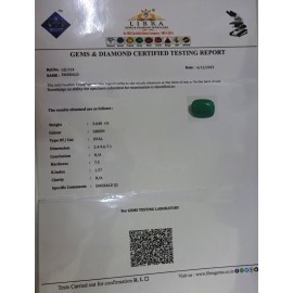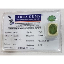 REPORT NO . LEJ 8CLARITY . N/ACOLOUR . GREENSHAPE / CUT . OVALWT . 5.78 CTSDIMENSION . 3-1.10-7.6-8.R . INDEX . 1.57HARDNESS . 7.5COMMENT  . EMERALD ( J )..