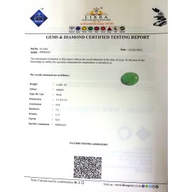 DATE:12-10-2023REF.NO:LE 1061NAME:EMERALDWEIGHT:4.28 CTSCOLOUR:GREENTYPE OF/CUT:OVALDIMENSION:2.7-8.5-5.4CONCLUSION:N/AHARDNESS:7.5R.INDEX:1.57CLARITY:N/ASPECIFIC COMMENTS:EMERALD..