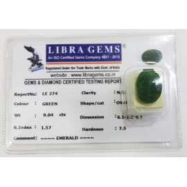 REPORT.NO.-LE 274CLARITY.-N/ACOLOUR.-GREENSHAPE/CUT.-OVALWT.-9.04 CTSDIMENSION.-6-1.2-6.6-1.R.INDEX.-1.57HARDNESS.-7.5COMMENT.-EMERALD..
