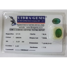 REPORT NO . LE 21CLARITY . N/ACOLOUR . GREENSHAPE / CUT . OVALWT . 3.27 CTSR . INDEX . 1.57HARDNESS . 7.5COMMENT . EMERALD..