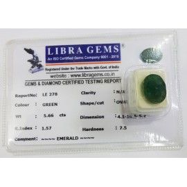REPORT.NO.-LE 278CLARITY.-N/ACOLOUR.-GREENSHAPE/CUT.-OVALWT.-5.66 CTSDIMENSION.-4-1.10-5.5-7.R.INDEX.-1.57HARDNESS.-7.5COMMENT.-EMERALD..