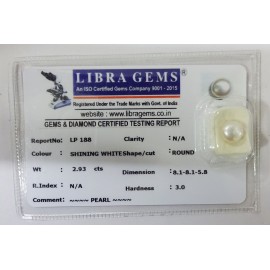 REPORT NO . LP 188CLARITY . N/ACOLOUR . SHINING WHITESHAPE / CUT . ROUNDWT . 2.93 CTSDIMENSION . 8-1.8-1.5-8.R . INDEX . N/AHARDNESS . 3.0COMMENT . PEARL..