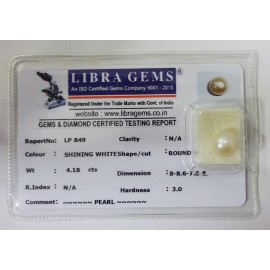 REPORT NO . LP 849CLARITY . N/ACOLOUR . SHINING WHITESHAPE / CUT . ROUNDWT . 4.18 CTSDIMENSION .8-8.6-7.8-8.R . INDEX . N/AHARDNESS . 3.0COMMENT . PEARL..