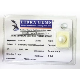 REPORT NO . LP 928CLARITY . N/ACOLOUR . SHINING WHITESHAPE / CUT . ROUNDWT . 5.00 CTSDIMENSION . 9-9.9-9.6-8.R . INDEX . N/AHARDNESS . 3.0COMMENT . PEARL..