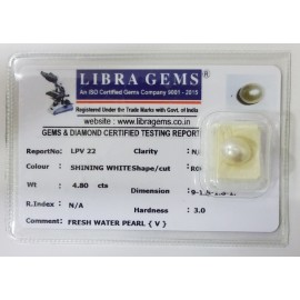 REPORT NO . LPV22CLARITY . N/ACOLOUR . SHINING WHITESHAPE / CUT . ROUNDWT . 4.80 CTSDIMENSION . 9-1.8-1.8-1.R . INDEX . N/AHARDNESS . 3.0COMMENT . FRESH WATER PEARL { V }..