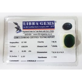 REPORT NO . LE 60CLARITY . N/ACOLOUR . GREENSHAPE / CUT . OVALWT . 8.00 CTSDIMENSION . 5-5.2-1.5-3.R . INDEX . 1.57HARDNESS . 7.5COMMENT . EMERALD ..