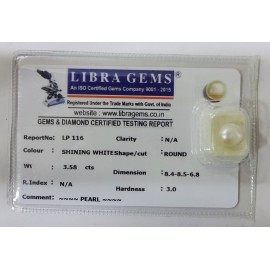 REPORT NO . LP 116CLARITY . N/ACOLOUR . SHINING WHITESHAPE / CUT . ROUNDWT . 3.58 CTSDIMENSION . 8-4.8-5.6-8.R . INDEX . N/AHARDNESS . 3.0COMMENT . PEARL..