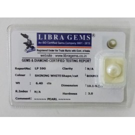 REPORT NO . LP 590CLARITY . N/ACOLOUR . SHINING WHITESHAPE / CUT . ROUNDWT . 6.40 CTSDIMENSION . 10-1.9-9.7-7.R . INDEX . N/AHARDNESS . 3.0COMMENT . PEARL..
