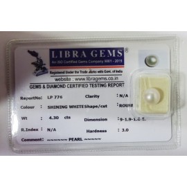 REPORT NO . LP 776CLARITY . N/ACOLOUR . SHINING WHITESHAPE / CUT . ROUNDWT . 4.30 CTSDIMENSION . 9-1.9-1.6-5.R . INDEX . N/AHARDNESS . 3.0COMMENT . PEARL..