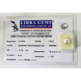 REPORT NO . LP 894CLARITY . N/ACOLOUR . SHINING WHITESHAPE / CUT . ROUNDWT . 4.70 CTSDIMENSION . 9-2.9-2.7-2.R . INDEX . N/AHARDNESS . 3.0COMMENT . PEARL..